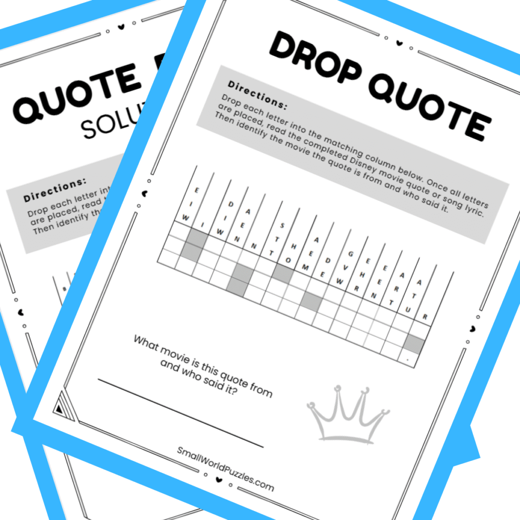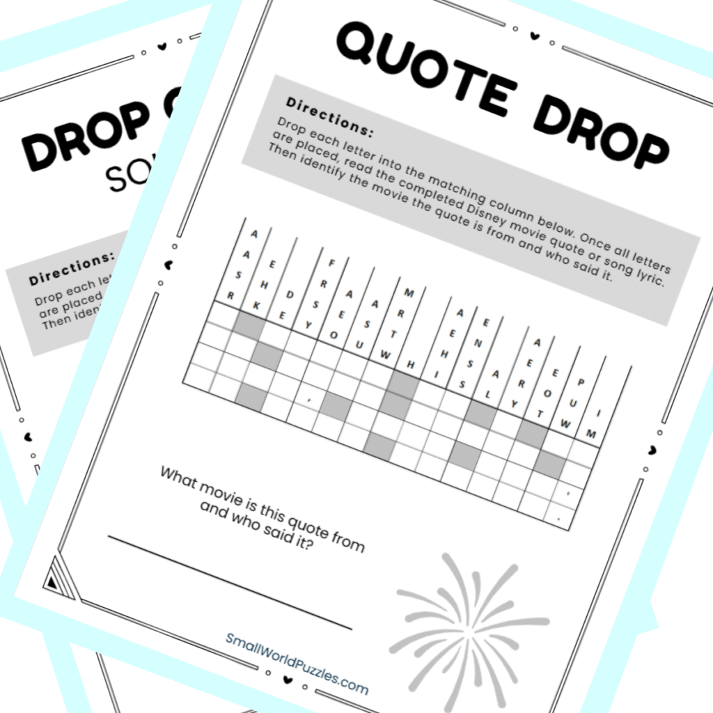 Discover a collection of free printable Disney-inspired drop quote puzzles designed to challenge your word skills and spark your curiosity. Also known as falling letters puzzles or quote fill-in puzzles, drop quotes ask you to use logic and pattern recognition to uncover a hidden quote or song lyric one letter at a time.